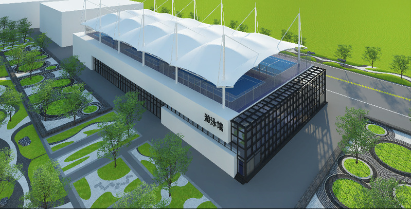 游泳馆项目总建筑面积约5000平方米(未含屋面雨棚建筑面积),主要建设内容包括室内游泳馆、屋面运动场和附楼三大部分:室内馆设标准8泳道恒温池及短道5泳道池;屋面建设4片网球场,配备雨棚、防滑地面及夜间照明设施;北侧3层附楼含更衣淋浴区、体能训练中心及特色运动空间。