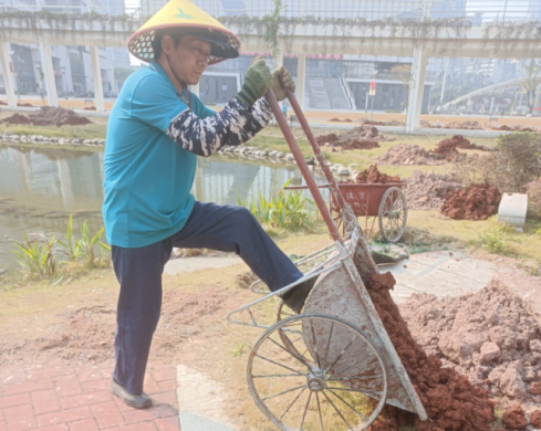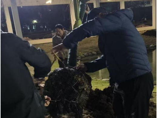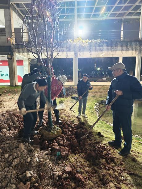 物业服务人员严格按照“挖坑—培土—定植—支撑—施肥”的标准流程作业,挖坑深度与直径精准匹配树木根系,通过换填新土,浇水,整理树穴,并于夜间加班加点地将樱花树苗植入,完成了树木的种植工作。