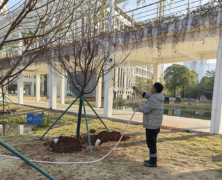 为优化校园生态环境,提升公共区域景观品质,2026年1月17日至22日,知合物业紧扣校园建设需求,在基建与后勤部的统筹指导下,在财源瀑布周边开展樱花树种植专项工作,为校园添新绿、赋新韵。