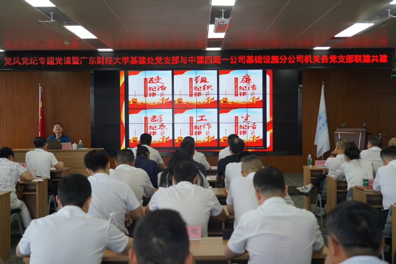 5月31日下午,基建处党支部全体党员前往广东江门市蓬江区,与中建四局一公司基础设施分公司机关党支部开展支部结对共建,以及工作业务交流和访企拓岗。 首先,广东财经大学马克思主义学院教授委员会主任、硕士生导师邱若宏教授,给全体党员讲授“严守党的纪律,做新时代合格党员”专题党课,从“中国共产党历来重视纪律建设、中国共产党纪律的内容特点和作用、新修订的《中国共产党纪律处分条例》、严守党的纪律做遵规守纪模范”等四个方面,深入浅出地讲解党的纪律建设要点,帮助党员进一步增强学纪、知纪、明纪、守纪的政治自觉、思想自觉、行动自觉。 随后,基建处党支部与中建四局一公司基础设施分公司机关党支部签署党支部结对联建共建协议,坚持“校企合作、共促发展”,加强党建引领,增强党组织的创造力、凝聚力、战斗力,明确党建共建、人才培养、业务互助、廉洁联助、资源联用等结对联建内容。 最后,基建处党支部与中建四局一公司基础设施分公司机关党支部开展工作业务交流以及访企拓岗,基建处党支部书记冯东海向中建四局相关负责人介绍我校2024届毕业生情况,并递交我校毕业生就业推荐材料,切实推进校企合作,并在相关人员陪同下参观江海产业园项目工程。
